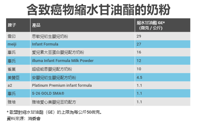 消委会总干事黄凤娴8月18日在港台节目《千禧年代》称,1款奶粉检出污染物氯丙二醇(3-MCPD)超出欧洲食物安全局建议的每日摄入限量,9款奶粉检出基因致癌物环氧丙醇,含量由每公斤1.1微克至29微克,都符合欧盟的上限规定。