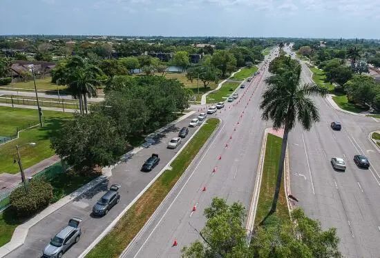 据《每日邮报》4月17日报道,无人机拍摄的照片显示,在南佛罗里达州的一个免下车食品配送点外,可以看到街道上蔓延着一条近1.5英里(约2.4公里)长的汽车线,因大量民众失业无钱吃饭,数千人正在排队领取免费食物。