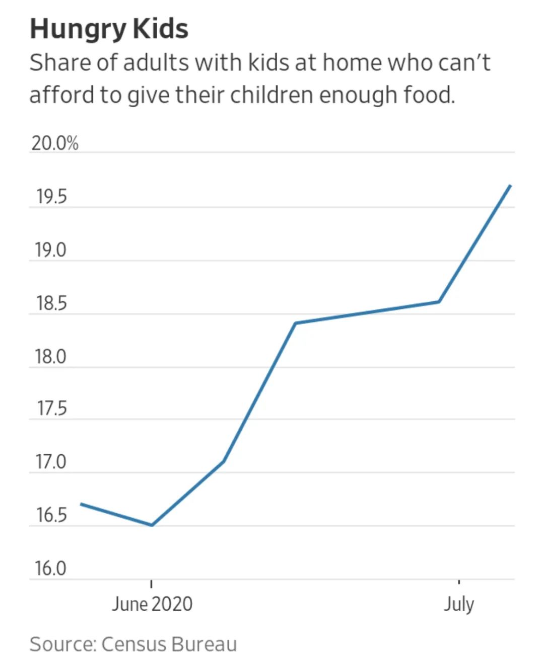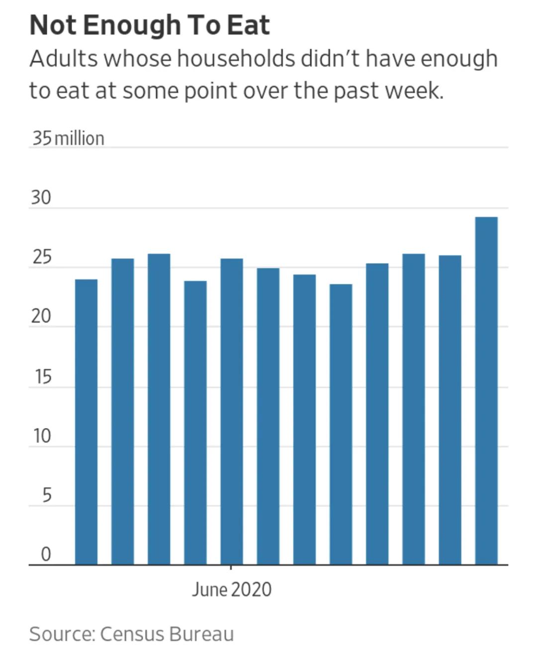 2.49亿受访的美国人中有大约12%,将近3000万人表示在7月21日左右,他们可能就没有足够的食物了。其中有540万人表示他们经常吃了上顿没下顿。