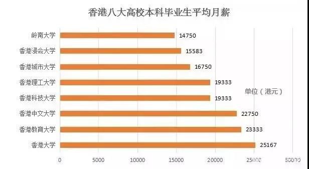 而八大院校之中,以香港大学毕业生薪酬最高,连同各式津贴年薪为30.2万港币,平均月薪25167港币。香港教育大学及香港中文大学的毕业生,以平均月收入23,333港币及22,750港币紧随其后。薪酬较低的香港岭南大学毕业生,平均月收入都有14,750港币。